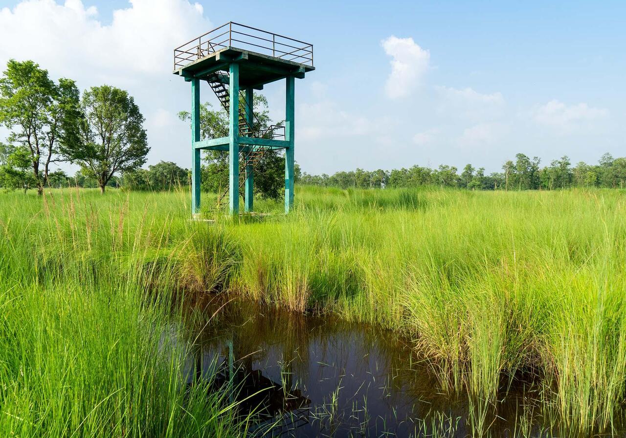 세계평화의 탑 꼭대기에서 건너편에 인접한 두루미 보호구역이 보입니다. 이 보호 구역은 이 지역 고유의 사루스 두루미에게 자연 서식지를 제공하기 위한 것입니다.
