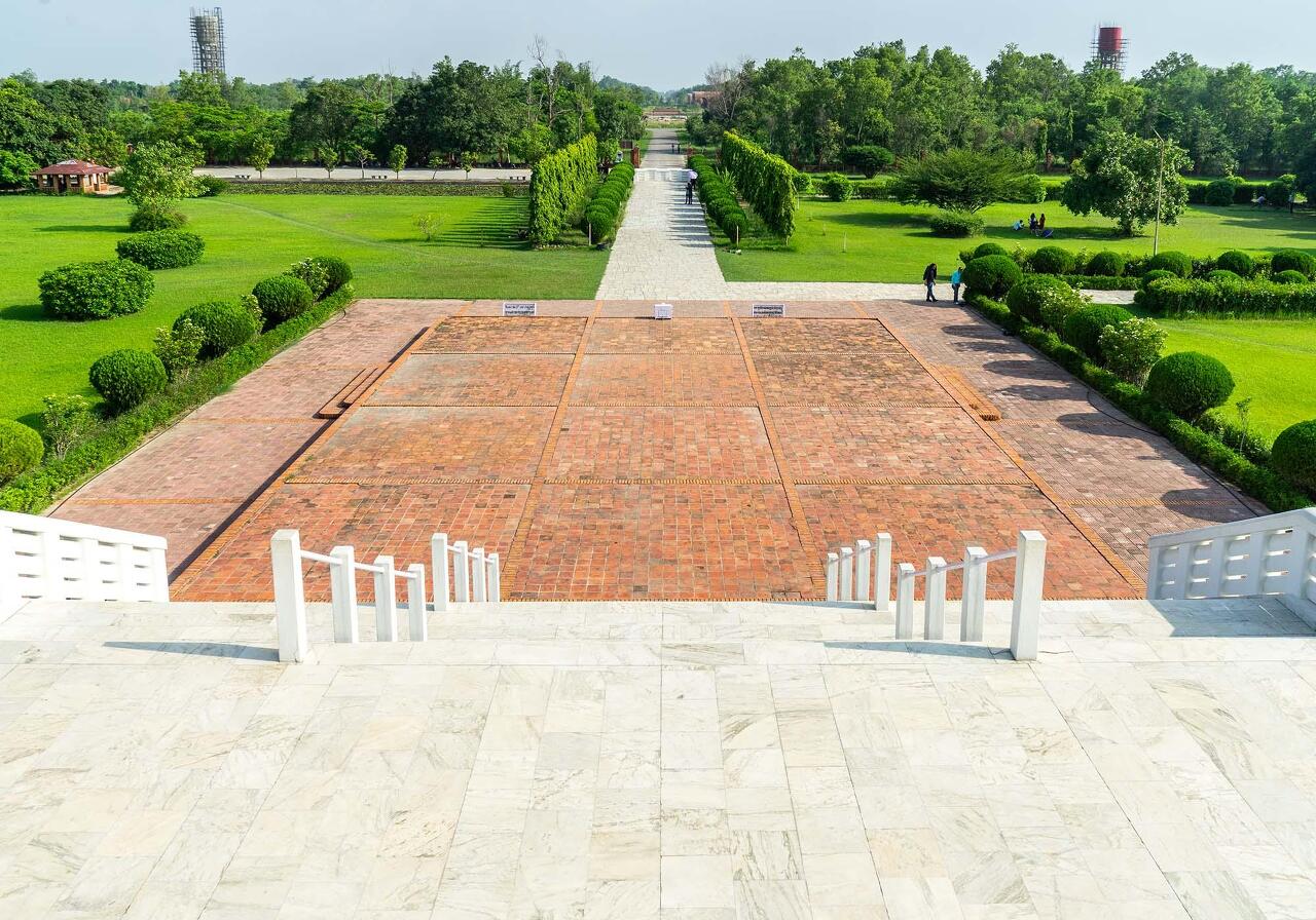 세계평화의 탑은 룸비니 마스터플랜 설계의 중심축에 있습니다. 마야데비 사원에서 사리탑까지의 직선은 3.2km(2마일) 동안 사이트 중심을 따라 이어집니다.