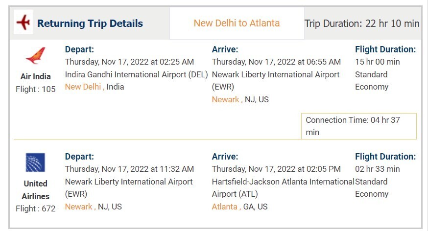 입국편: 카투만두->뉴델리->뉴왁 경유 -> 아틀란타