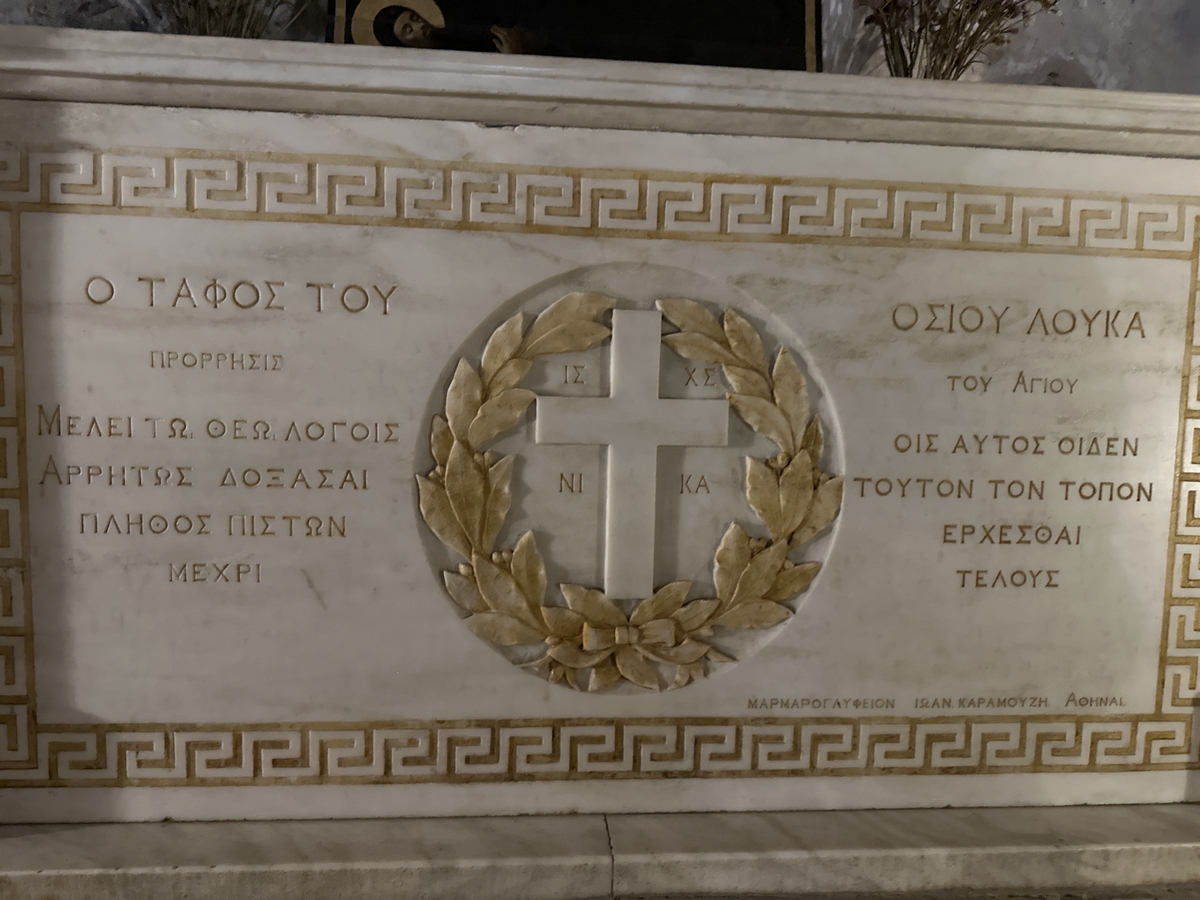 호시오스 루카스 성인의 무덤으로, 비문에 새겨진 그리스어는 성인의 기념비적인 위상을 나타내고 있습니다.이 비 문은 성 루카스의 거룩한 삶과 그가 신앙 공동체에 남긴 유산을 기리는 내용입니다.