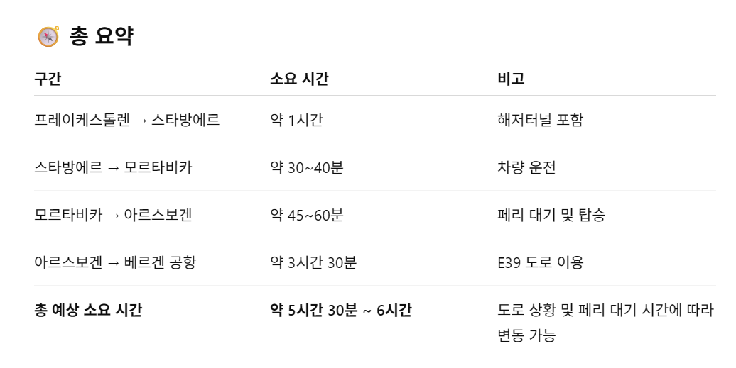 프레이케스톨렌 트레일 입구(Preikestolen Parking)에서 베르겐 공항(Bergen Airport, BGO)까지의 이동은 차량과 페리를 이용한 육로 경로로 약 5시간 30분에서 6시간이 소요됩니다. 노르웨이의 E39 고속도로 구간 중 Mortavika(모르타비카)와 Arsvågen(아르스보겐) 사이에는 현재 다리나 터널이 없으며, 차량과 승객은 **페리(여객선)**를 이용하여 이 구간을 이동해야 합니다. 페리는 예약이 필요 없는 자동차용 로컬 페리입니다. 현재 운항사의 운행 시간은 이곳에서 확인 가능합니다.