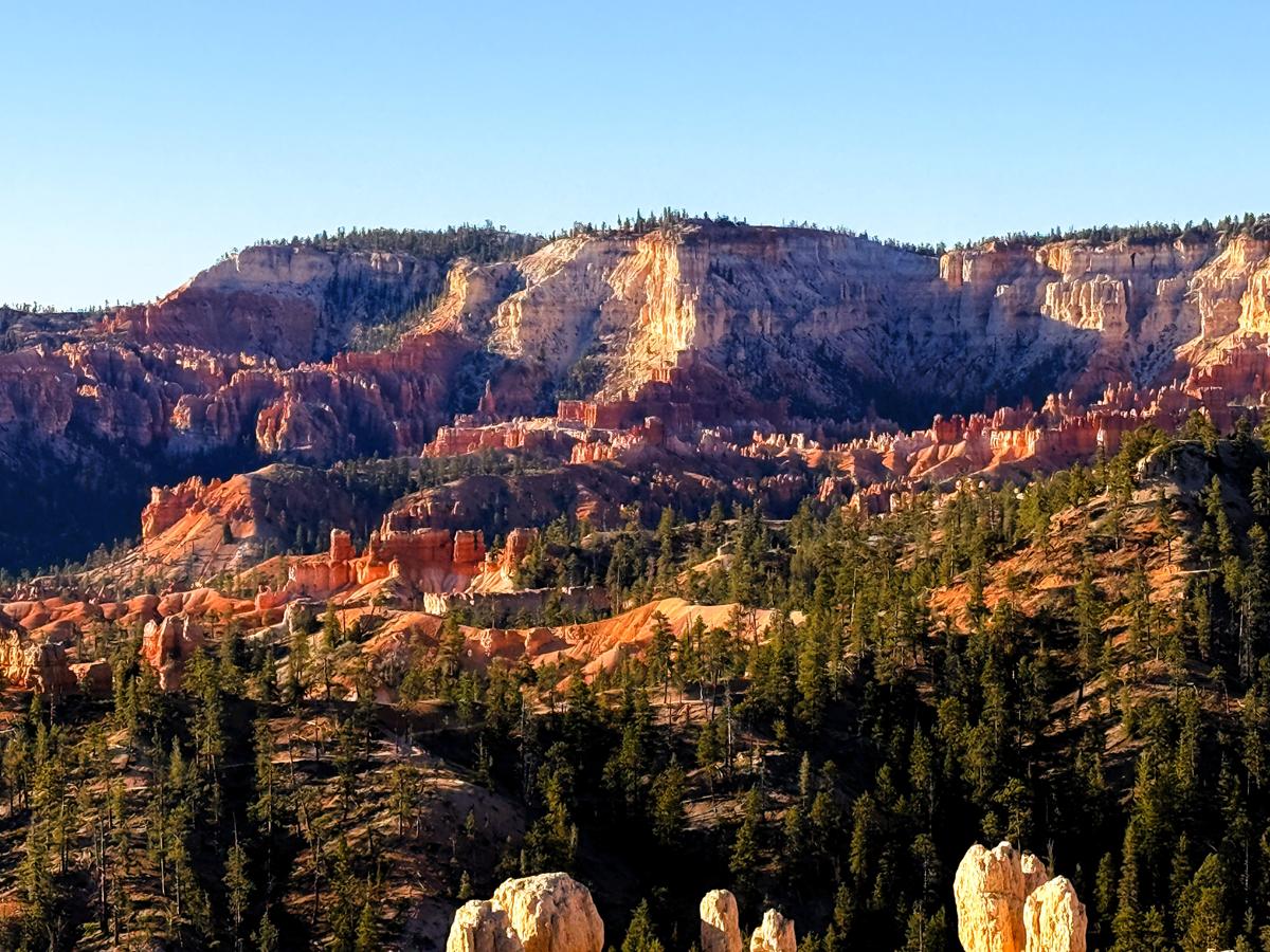 멀리 겹겹이 겹친 블루톤의 고원과 평원은 아침 햇살을 받아도 급히 색을 바꾸지 않습니다. 대신, 옅은 안개와 대기의 층이 겹치며 거리감과 고도를 차분하게 강조합니다. 가까운 곳은 따뜻해지고, 먼 곳은 여전히 차갑게 남아 있는 이 순간이야말로, 브라이스가 단순한 ‘풍경’이 아니라 시간의 흐름을 눈앞에서 보여주는 공간임을 실감하게 합니다.
