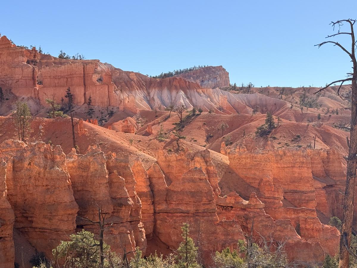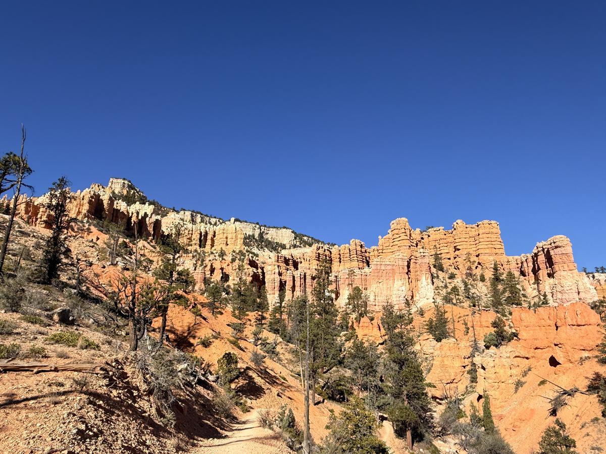 이 나무는 화려한 후두나 전망보다도, 브라이스 캐니언이 정적인 경관이 아니라 끊임없이 변해온 살아 있는 지형임을 알려줍니다. 불과 시간 앞에서 자연은 파괴되기만 하는 것이 아니라, 이런 형태로 기억을 남기며 풍경의 일부가 됩니다. 트레일을 걷는 이에게는 잠시 걸음을 늦추게 만드는, 매우 묵직한 장면입니다.