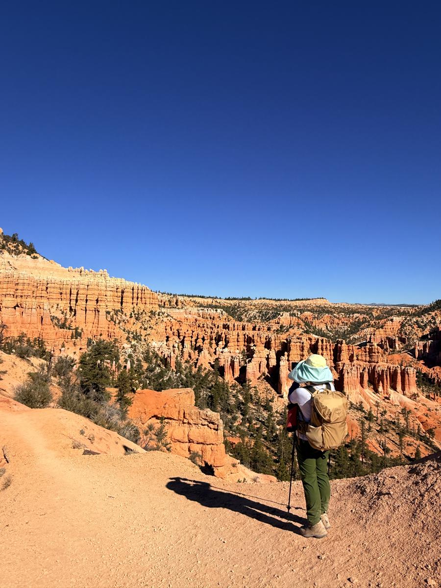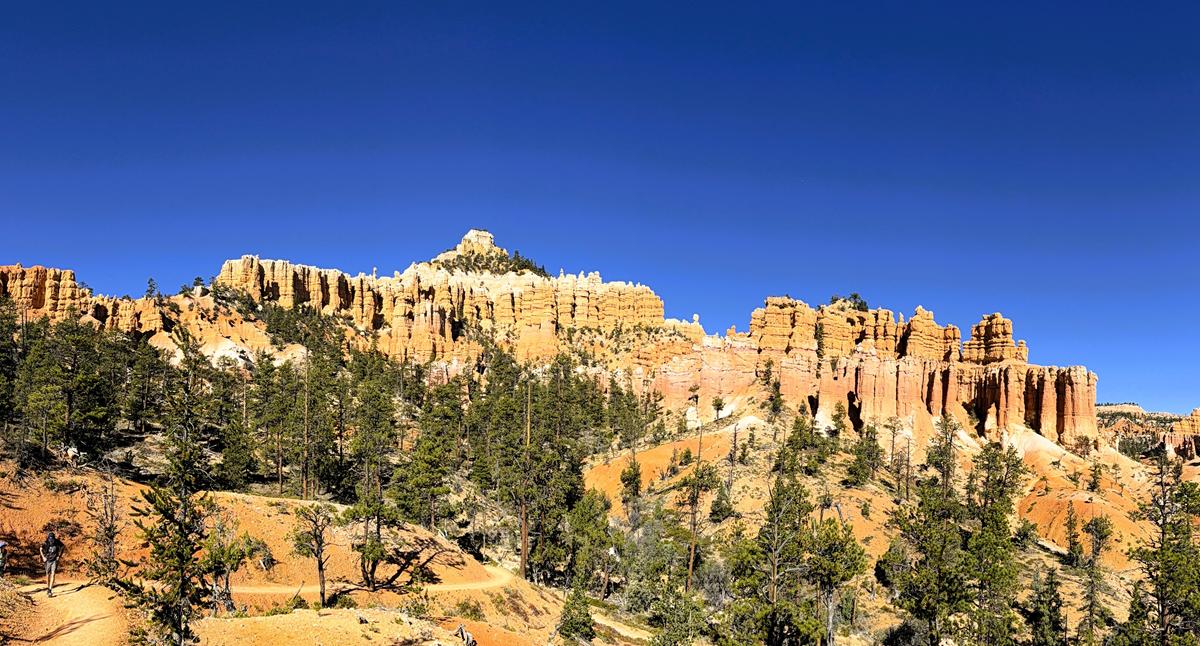 또 하나의 인상은 스케일감입니다. 능선 위의 사람들은 풍경 속에 자연스럽게 녹아들어, 이곳이 ‘걷는 풍경’이면서 동시에 인간을 압도하는 지질 무대임을 분명히 보여줍니다. 맑은 하늘 아래 주황·백색 암층의 층리가 또렷해, 브라이스가 왜 “침식의 교과서”로 불리는지 직관적으로 이해하게 만드는 장면입니다.