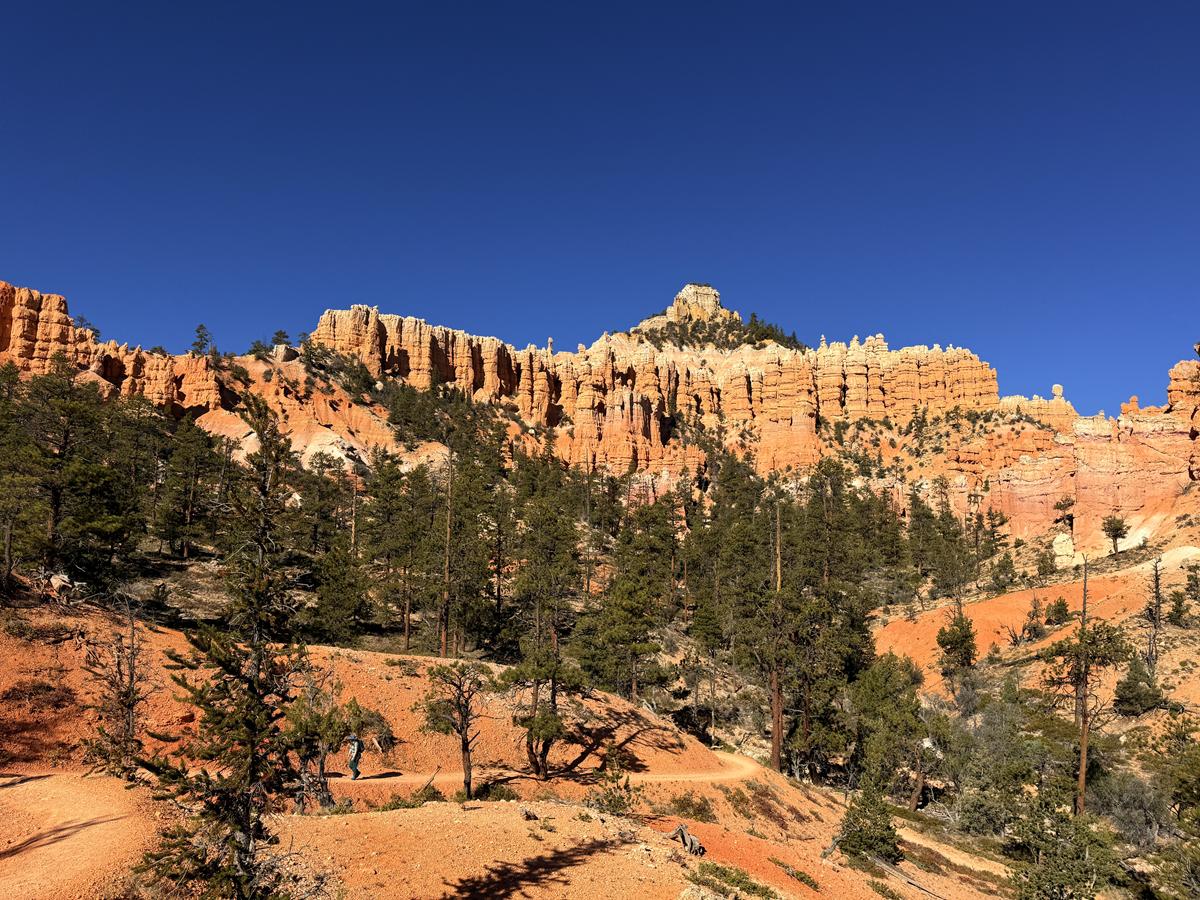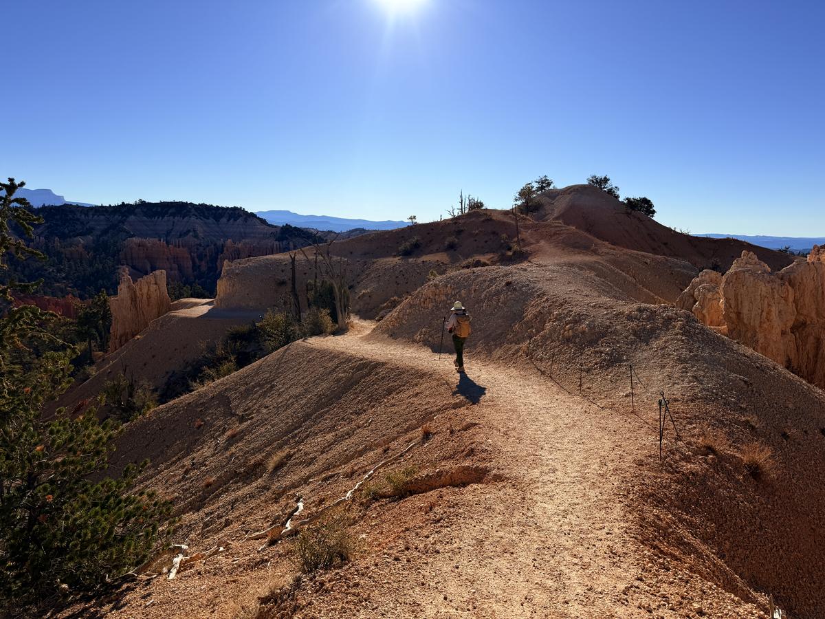 중반부에 접어들면 후두 숲 사이로 갑자기 넓은 배경이 등장합니다. Boat Mesa와 주변의 완만한 지형이 시야에 들어오며, 지금까지 걸어온 후두 숲이 하나의 전경으로 정리됩니다. 이 지점에서는 브라이스 캐니언이 깊게 파인 협곡이 아니라, 고원 가장자리가 서서히 침식되어 만들어진 지형이라는 사실이 분명해집니다. 후두는 ‘산’이 아니라 남겨진 잔재라는 점이 시각적으로 이해되는 구간이며, 사진보다 실제 눈으로 볼 때 지형의 규모감이 훨씬 크게 느껴집니다.